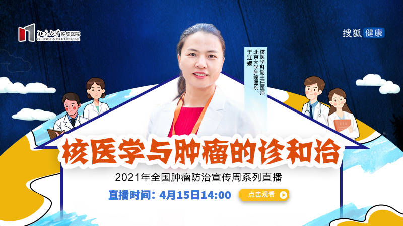 今年是第27个全国肿瘤防治宣传周。在中国医学科学院肿瘤医院、北京大学肿瘤医院、重庆大学附属肿瘤医院等多家医院的支持下,搜狐健康将在4月中下旬开展数十场系列直播,围绕“健康中国健康家——关爱生命科学防癌”这一主题,邀请多位专家介绍防癌知识,倡导大家做好防癌体检。《核医学与肿瘤诊疗》是搜狐健康与北大肿瘤医院系列合作的第六期直播。4月15日14: 00,北京大学肿瘤医院核医学科副主任医师于江源将花一个小时介绍核医学在肿瘤中的作用,并回答观众提问。请注意。