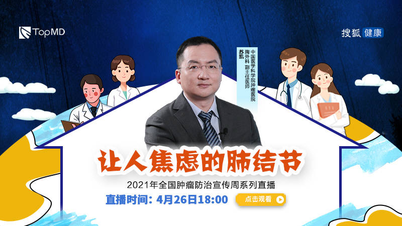 4月26日(周一)18:00-19:00,中国医学科学院肿瘤医院胸外科副主任医师苏凯教授将在搜狐健康生活室解答关于肺结节的各种疑惑。请注意。